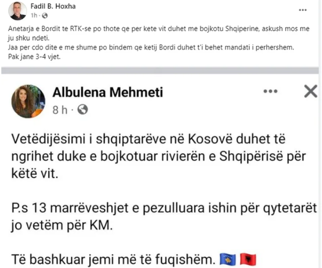 KOSOVË- ‘Të bojkotohet bregdeti shqiptar’- kjo është thirrja e bërë nga anëtarja e Bordit të Radio Televizionit të Kosovës (RTK), Albulena Mehmeti.