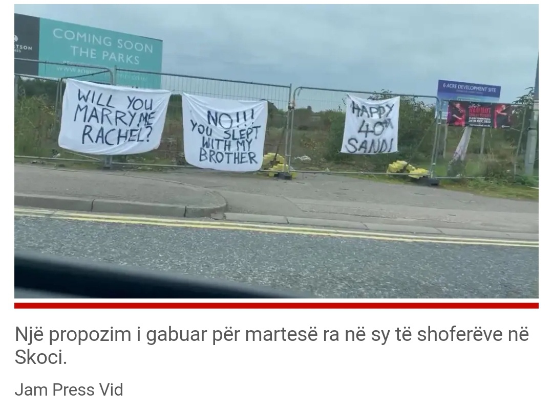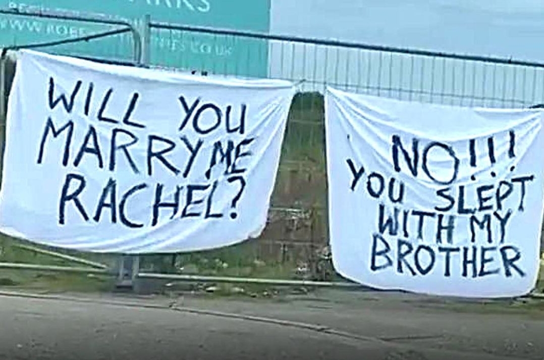Sipas pamjeve të siguruara nga Jam Press, një skocez i irrituar vari një banderolë të bardhë në gardhin e rrethrrotullimit të zbukuruar me tekst të shkruar me dorë, ku shkruhej: "A do të martohesh me mua, Rachel?"