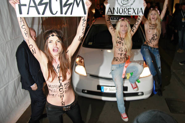 Siç raporton agjencia e lajmeve NOA.al, në prag të fillimit të sfilatës së Versace aktivistet u paraqitën të zhveshura dhe të mbuluara me shkrime se “Fashion i njëjtë me fashizmin” dhe krahas tyre edhe mesazhe kundër anoreksisë së modeleve.