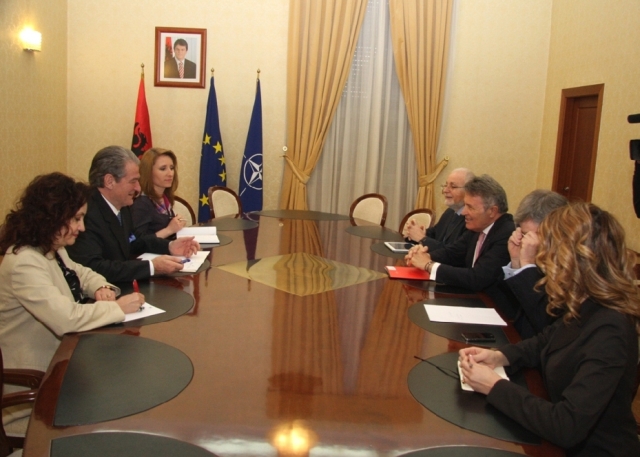 Tiranë, 3 prill 2012, NOA- Kryeministri i vendit Sali Berisha gjatë paradites së sotme priti në takim Presidentin e Agjencisë Kombëtare për mbështetjen e investimeve në vend dhe jashtë (INVITALIA) Giancarlo Innnocenzi Botti, së bashku me ambasadorin italian në vendin tonë Massimo Gaiani.