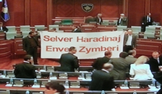 Prishtinë, 12 prill 2012, NOA – Kuvendi i Kosovës ndërpreu për pak minuta punimet në seancën plenare të së enjtes, për shkak të protestës së deputetëve të lëvizjes Vetëvendosje, të cilët në hyrje të seancës mbanin në duar një pankartë me mbishkrimin Selver Haradinaj, Enver Zymberi, në përkujtim të dy shqiptarëve të vrarë në veri të Kosovës nga serbët, raporton agjencia e lajmeve NOA.al.