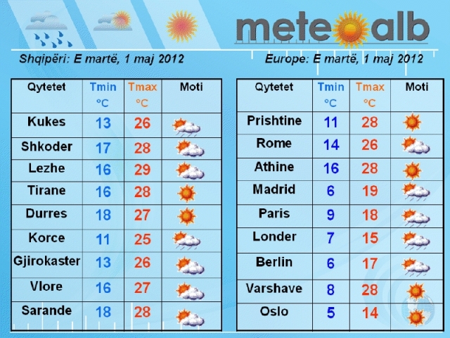 Tiranë, 30 prill 2012, NOA- Sipas MeteoAlb, për sa i përket ditës së nesërme, dita do të nisë me kthjellime në të gjithë territorin por duke ju afruar mesditës do të ketë kalime vranësirash nëpër të gjithë vendin, më të theksuara në verilindje dhe juglindje duke rrezikuar shira të dobët dhe të përkohshëm.