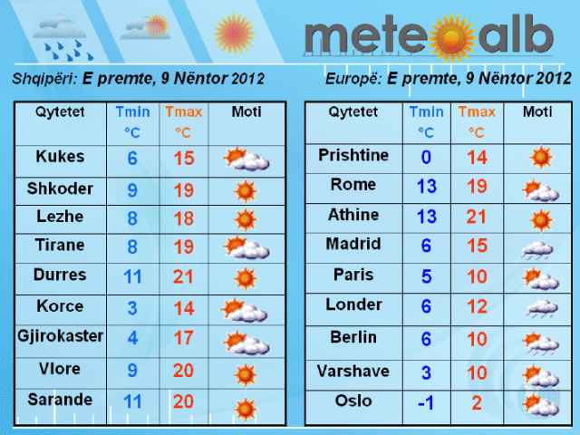 Tiranë, 8 nëntor 2012, NOA- Sipas MeteoAlb, zhvillimi i një qendre me presion të lartë atmosferik mbi Pellgun e Mesdheut do të kushtëzojë mot të qëndrueshëm edhe në territorin shqiptar. Për rrjedhojë kthjellimet do të dominojnë në pjesën më të madhe të vendit me përjashtim të zonave malore veriore ku do të shfaqen herë pas here vranësira të lehta dhe kalimtare. Po ashtu edhe pasditja do të vijojë me kthjellime në zonat e ulëta dhe ato bregdetare ndërsa sërish në zonat malore përveç kthjellimeve do të ketë edhe vranësira të lehta.
