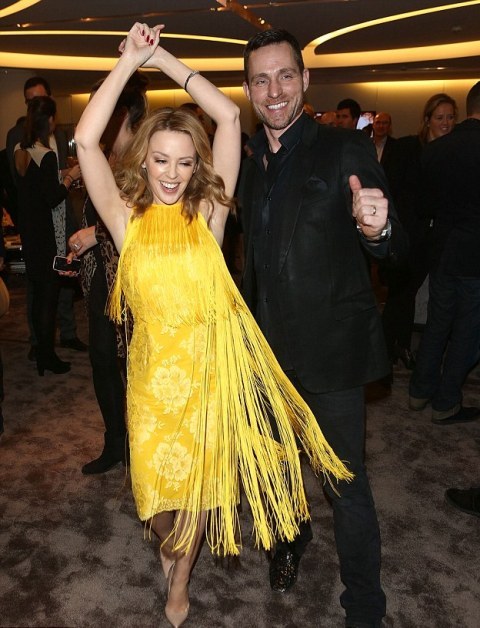 Kylie Minogue e lumturuar dhe rrezatuese shfaqet e veshur me fustan ngjyrë të verdhë, duke vallëzuar përkrah shokut të saj, Jeff Leatham.