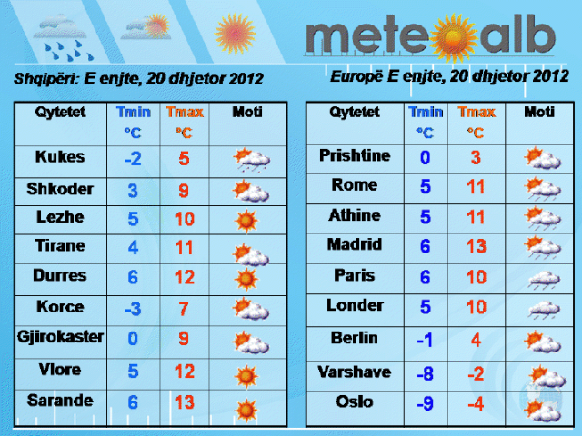 Tiranë, 19 dhjetor 2012, NOA- Sipas MeteoAlb, për sa i përket vendit tonë, që në orët e para të mëngjesit dominuese do të jenë kthjellimet në pjesën më të madhe të tij, përjashtuar zonat malore të cilat do të kenë vranësira të herë pas hershme.