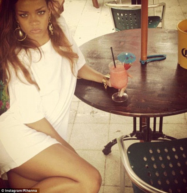 Këngëtarja Rihanna është parë në disa poza provokuese teksa pinte një lëng apo duke i dhënë biçikletës me një fustan të bardhë të shkurtër.