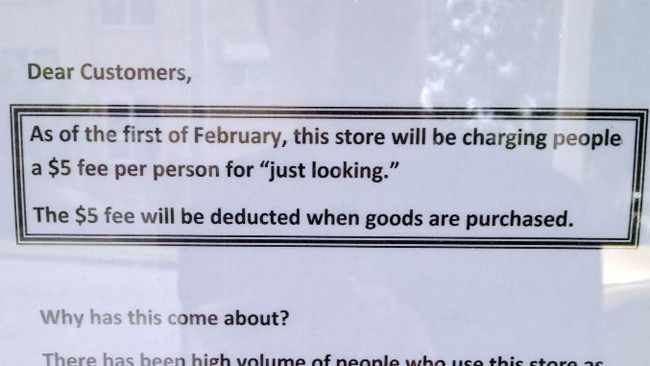 Një dyqan në Coorparoo të Australisë u ka thënë ndal, gjithë atyre personave që hynin brenda tij vetëm për të parë, duke aplikuar një tarifë 5 dollarë për këdo që hyn, blen apo nuk blen gjë.