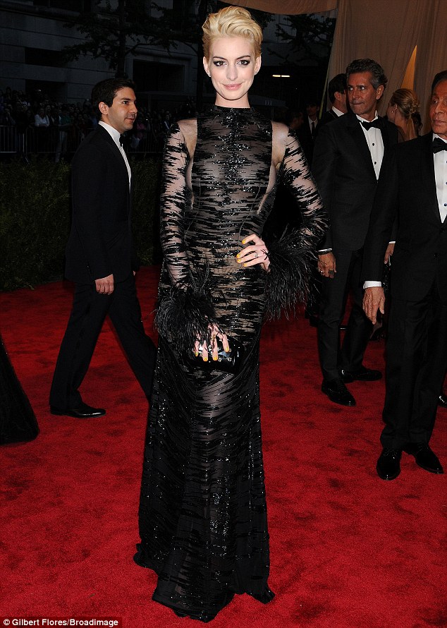Kësaj radhe aktorja Anne Hathaway nuk është kursyer dhe as përmbajtur si herët e tjera. Gjatë Met Gala 2013 në Metropolitan Museum në New York, aktorja është parë me flokë biondë dhe me një look thuajse trasgresiv, ku fustani transparent i nxirrte dukshëm në pah hiret.