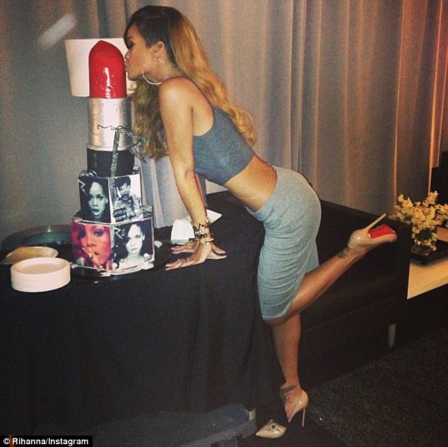Torta në fjalë ishte e veshur edhe me fotografi të këngëtares, ku 25 vjeçarja para se ta priste, u soll rreth saj në poza provokuese teksa reklamonte buzëkuqin e linjës RiRi Woo.