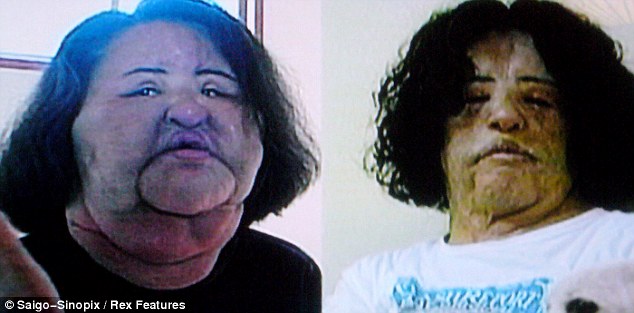 Hang Mioku’s face was left so swollen by the silicone and cooking oil, left, that her own parents did not recognise her. Despite 10 operations her face is still severely disfigured, right