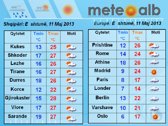 Për sa i përket pjesës tjetër të kontinentit do të dominohet nga kushte të qëndrueshme atmosferike ku moti i kthjellët do të jetë prezent, si rezultat i vendosjes së qendrave me presion të lartë atmosferik në pjesën më të madhe të Europës.a.y/noa.al