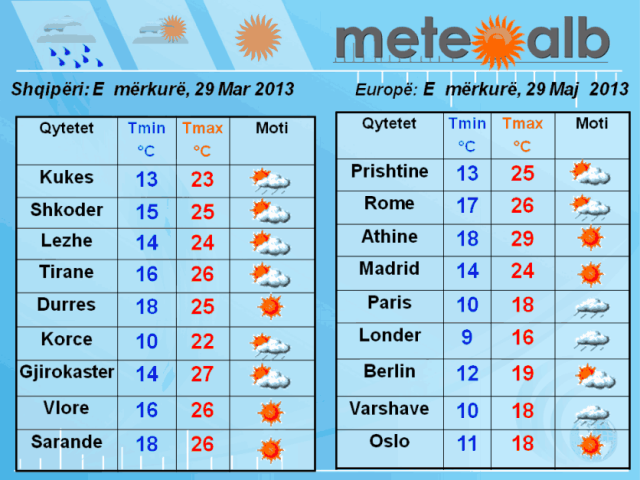Ndërsa, pasditja do të sjellë kalim të vranësirave në vend ku më të theksuara do të jenë në zonat verilindore dhe juglindore duke rrezikuar shira të dobët, situatë e cila do të vijojë në mbrëmje dhe gjatë natës.