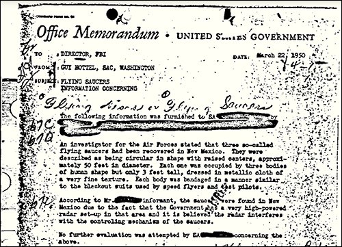 Memo ishte shkruar nga një agjent special i FBI, Guy Hottel, i cili ka mbledhur dëshmitë e një piloti të një avioni Air Force, i cili ka ndjekur tre disqet fluturues në New Mexico.