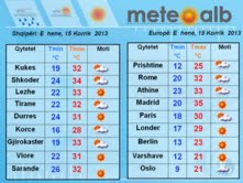 Tiranë, 13 korrik 2013, NOA – Sipas Meteoalb, gjatë ditës së pasnesërme, zonat e ulëta dhe bregdetare do dominohen nga moti i kthjellët, ndërsa me kthjellime dhe vranësira të herëpashershme paraqitet e gjithë zona malore e Shqipërisë. Për shkak të temperaturave të larta gjatë pasdites, vranësirat do të zhvillohen në zonat lindore duke rrezikuar shira të karakterit lokal. Ndërsa e gjithë pjesa tjetër e territorit do të mbetet nën dominimin e kthjellimeve dhe vranësirave kalimtare.