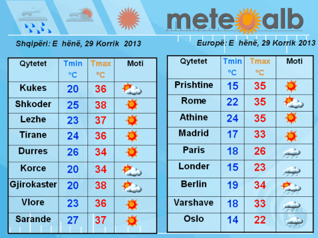 Pjesa e dytë e ditës do të vijojë me kthjellime dhe vranësira te lehta në zonat malore duke lënë me mot të kthjellet dhe temperatura te larta zonat e ulëta dhe bregdetare.