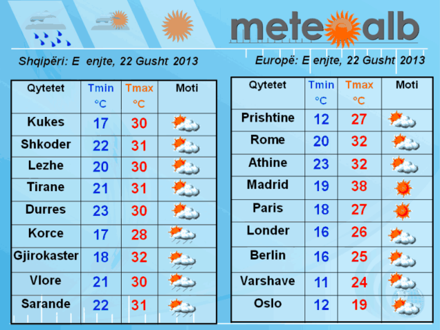 Gjatë së enjtes, do të vijojë ndikimi i qendrave ciklonare në Europën Jugore dhe për pasojë gadishulli Apenin dhe pjesërisht Ballkani do të mbeten me vranësira dhe herë pas here me rrebeshe shiu. Po ashtu, me vranësira dhe stuhi të forta ere paraqiten kushtet meteorologjike në Ishujt Britanikë dhe vendet e Balltikut.