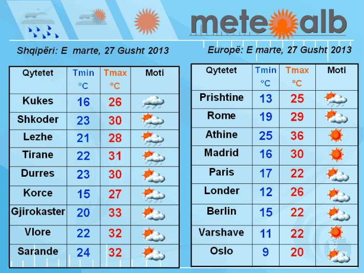 Tiranë, 26 gusht, NOA – Sipas MeteoAlb: Ditën e martë, 27 gusht 2013, në orët e para, territori shqiptar do karakterizohet nga vranësira në veri-qendër të cilat gjatë mesditës do të fuqizohen dhe për pasojë rrebeshe shirash afat-shkurtër do të bien në këto zona. Ndërsa kthjellime dhe vranësira kalimtare do të ketë në zonat jugore të vendit.