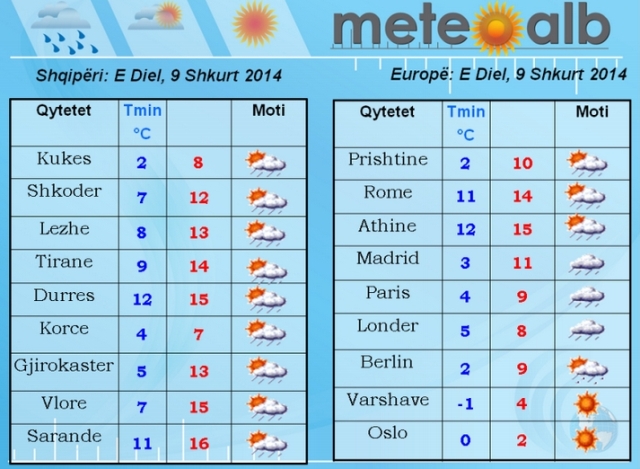 Një sistem i fuqishëm vranësirash do të zhvillohet në vendet perëndimore duke kushtëzuar mot të paqëndrueshëm në këto rajone të kontinentit. Problematike situata paraqitet në ishujt Britanike, Francë dhe Gjermani ku reshjet e shiut dhe të dëborës do të jenë të konsiderueshme. Po ashtu me vranësira, shira dhe stuhi të forta ere do të jenë Portugalia dhe Spanja, në këto rajone do të ketë probleme edhe në trafikun detar. Vranësira dhe reshje shiu e dëbore do të ketë edhe Europa juglindore por në sasi të pakta.