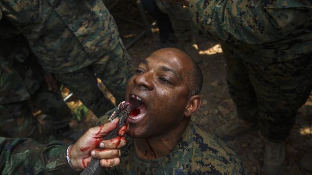 Të pish gjak gjarpri, të hash krimba dhe merimanga, dhe të mësosh se si të vrasësh një pulë me dhëmbë, janë këto disa nga provat e kurajës që disa marinsa i janë nënshtruar gjatë stërvitjes së ekipit “Cobra Gold 2014”, një kurs stërvitje ekstreme për ushtarët e ekipit.