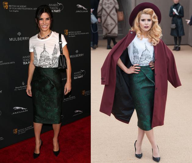 Sandra Bullock dhe Paloma Faith janë paraqitur me të njëjtën veshje, e cila mban firmën e Burberry Prorsum. Ato kanë veshur një T-shirt të bardhë me monumente të kryeqytetit britanik dhe një fund të gjelbër.