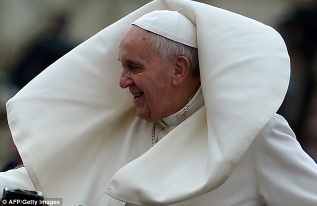 E megjithatë, ndryshe nga sa mund të mendohet, Papa nuk është bezdisur aspak nga kjo shaka e natyrës, por ka vazhduar i qetë fjalimin e tij, edhe kur era i fluturoi tutje kapelën e bardhë papnore.