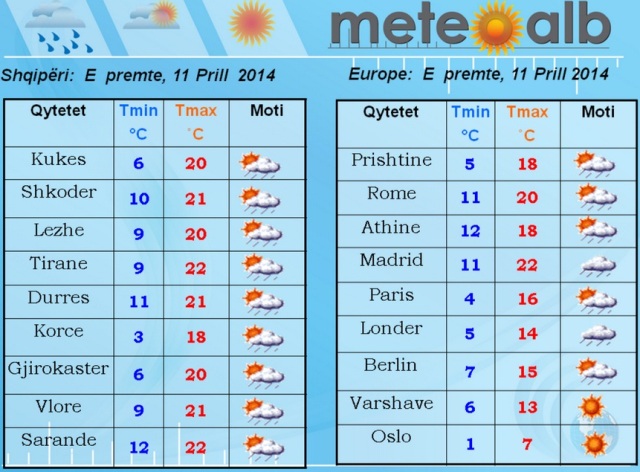 Tiranë, NOA.al- Sipas MeteoAlb, dita e nesërme do të nisë me kthjellime në të gjithë vendin por duke ju afruar orëve të mesditës do të ketë shtim të vranësirave duke rrezikuar shira të dobët dhe lokalë.