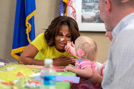 Një nga 14 fëmijët e pranishëm në këtë aktivitet ngjiti me ngjitës, lule në fytyrën e Michelle. Ndërkohë kjo e fundit deklaroi lidhur me këtë ngjarje se, “Kjo është pjesa më e mirë e ditës”./a.y/noa.al/