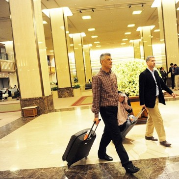 Në foto shihet kryeministri Thaçi së bashku me këshilltarin e tij Bekim Çollaku, në hollin e një hoteli teksa mban vete valixhen e tij. Noa.al