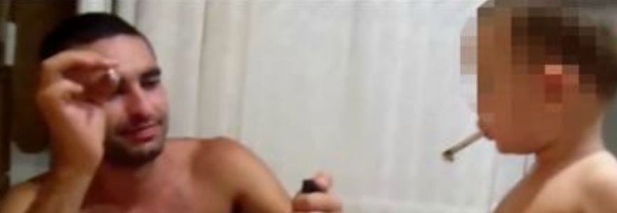 Gjysmë të zhveshur para tavolinës dhe me një cigare në dorë. Kështu një fëmijë vetëm 2 vjeç është filmuar ndërsa i ati i mëson se si të pijë cigare.
