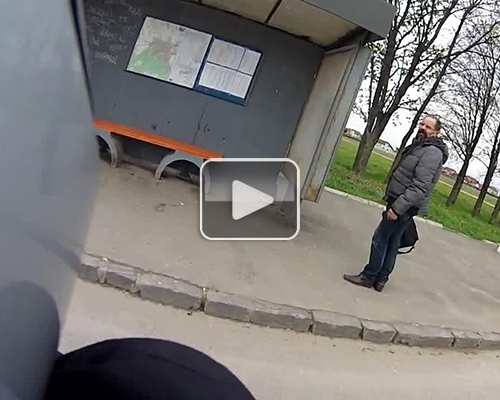 Një motoçiklist rend pas një autobusi në qytetin e Brasovit, Rumani dhe e kalon atë në mënyrë që një burrë ta kapë autobusin.