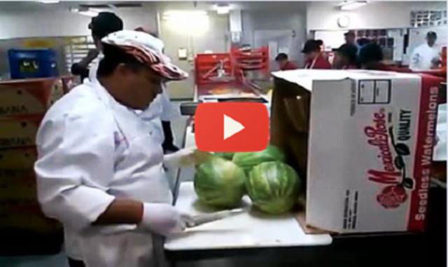 Një ndihmës kuzhinier i një restoranti nuk humb kohë duke prerë shalqinjtë që ndodhen para tij, por në vend të kësaj, ai përdor aftësitë e tij me thikën për t’i prerë ato me një shpejtësi shumë të madhe.
