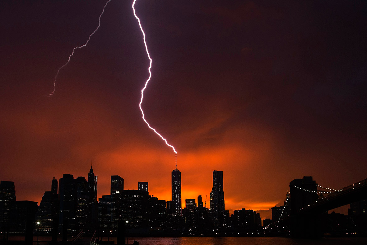 Njujorkezët janë përballur me një shfaqje spektakolare si pasojë e një stuhie verore që përfshiu gjithë qytetin. Shkrepëtima rrufeje ndriçuan qiellin e Manhattan, duke goditur qendrën tregtare One World Trade Center.