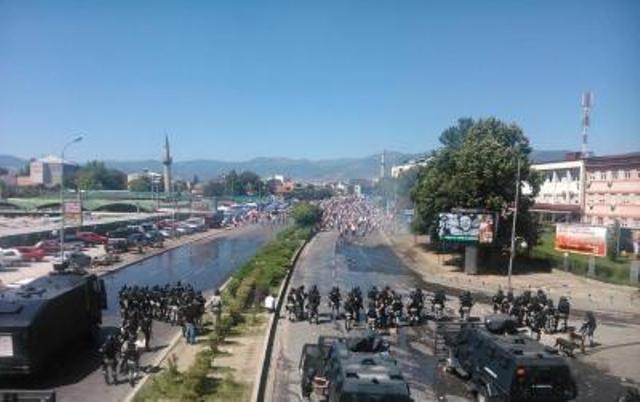 Situata është tensionuar në momentin që protestuesit kanë gjuajtur me gurë kundrejt gjykatës, gjë e cila ka bërë që forcat policore të reagojnë. Ata kanë përdorur gaz lotësjellës, bomba dhe topa me ujë kundër protestuesve, në zonën e njohur si Bit Pazari në Shkup.