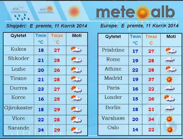 Tiranë, NOA.al – Sipas MeteoAlb, zonat malore si edhe një pjesë e zonës së ulët do të dominohen nga vranësira dhe shira të dobët ndërsa zonat bregdetare do të dominohen nga alternim të kthjellimeve dhe vranësirave të herë pas hershme.