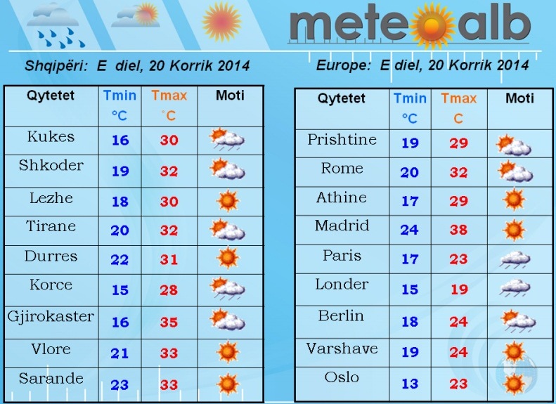 Orët e pasdites do vijojnë me kthjellime në zonat e ulta dhe bregdetare ndërsa shtim të vranësirave do të ketë në zonat veriore dhe verilindore duke i rrezikuar këto zona nga shira të përkoshëm të karakterit lokal.