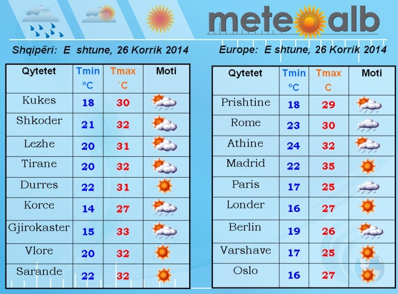 Britania e Madhe dhe Europa Perëndimore do të përfshihet nga sisteme të fuqishme vranësirash të cilat do të gjenerojnë shira të cilat gjatë orëve të pasdites, do të shoqërohen me stuhi të forta ere dhe për pasojë në këto rajone, shirat do të jenë në formë rrebeshi. Rajoni i Mesdheut dhe Europa Juglindore paraqiten kryesisht me vranësira dhe shira të përkohshëm. Ndërsa, Europa Jugperëndimore, gadishulli skandinav dhe Europa lindore do të dominohet nga moti i kthjellët./a.y/noa.al/