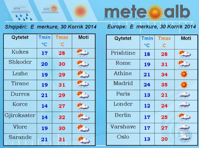 Europa Veriore dhe vendet e Balltikut do të karakterizohen nga vranësira dhe shira të dobët deri në mesditë, por vranësirat do të fuqizohen gjatë pasdites duke intensifikuar shirat në këto rajone të kontinentit. Me vranësira dhe shira të dobët dhe afat-shkurtër do të mbeten edhe vendet Mesdhetare, ku herë pas here do të ketë edhe rrebeshë.