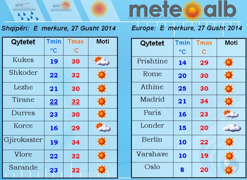 Vendet e Balltikut dhe Finlanda paraqiten në kushtet e vranësirave të fuqishme të shoqëruara me stuhi të forta ere dhe rrebeshe shirash. Po ashtu, në zonën Alpeve Europiane me shtrirje nga Franca deri në Slloveni do të vijojnë ndikimin e tyre masa ajrore të paqëndrueshme duke sjellë në këto rajone vranësira dhe shira. Ndërsa moti i kthjellët do të jetë dominant në Europën Lindore dhe Juglindore si edhe gadishullin Iberik./a.y/noa.al/