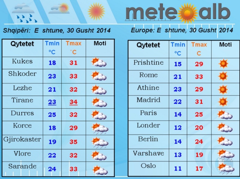 Tiranë, NOA.al- Sipas MeteoAlb, gjatë paradites, zonat veriore paraqiten me kthjellime dhe vranësira kalimtare ndërsa vranësira më të dukshme do të ketë në Qendër dhe Jug të vendit. Pjesa e dytë e ditës do vijojë me kthjellime dhe vranësira kalimtare në bregdet dhe zonën e ulët ndërsa zonat malore do të mbeten me kthjellime dhe vranësira. Vranësira më të dendura do të ketë në zonat Jugore dhe Qendrore ku parashikohen edhe shira të dobët e të përkohshëm. Në mbrëmje, vranësirat tërhiqen drejt Verilindjes duke lënë pjesën tjetër të vendit nën kushtet e kthjellimeve. Temperaturat e ajrit do të pësojnë një rritje të ndjeshme gjatë orëve të mëngjesit ndërsa vetëm një rritje e lehtë pritet për temperaturat e mesditës. Era do të vijojë të fryjë mesatare, me shpejtësi deri 35 km/h nga drejtimi verior dhe veriperëndimor duke gjeneruar në det, dallgë deri 3 ballë.