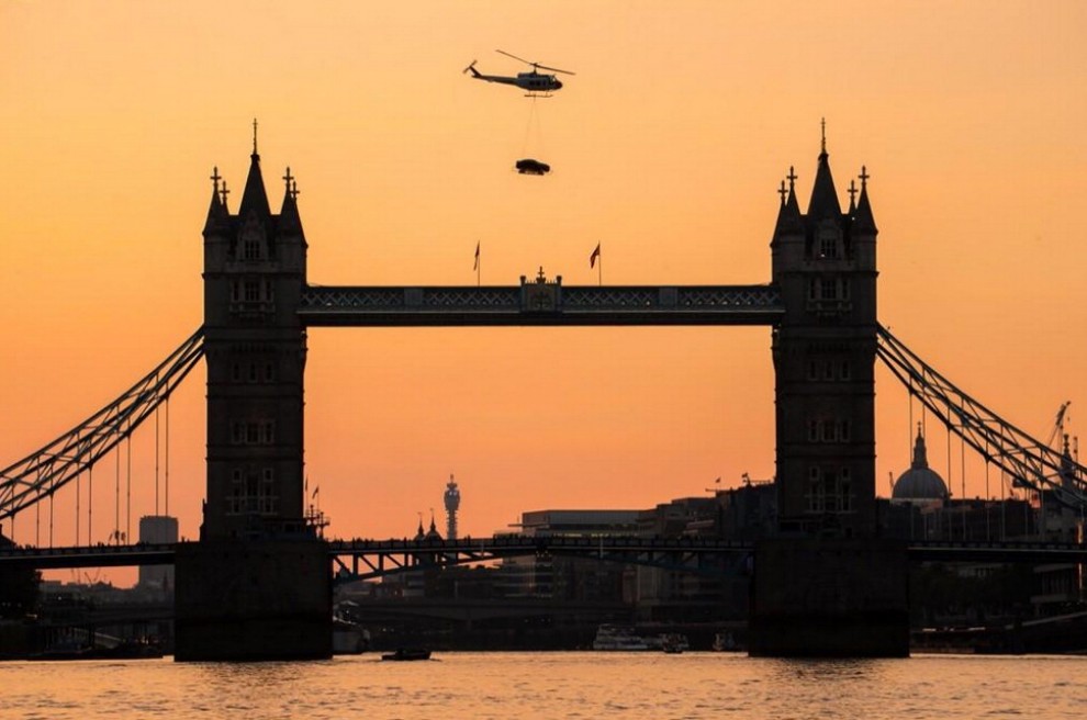 U shfaq në mëngjes në qiellin e kryeqytetit anglez, teksa transportohej nga një helikopter.