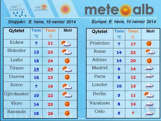 Tiranë, NOA.al – Sipas MeteoAlb: Masat ajrore të qëndrueshme do të karakterizojnë mot të kthjellët në vendin tonë. Orët e mesditës do të sjellin kalime vranësirash nëpër të gjithë territorin shqiptar.
