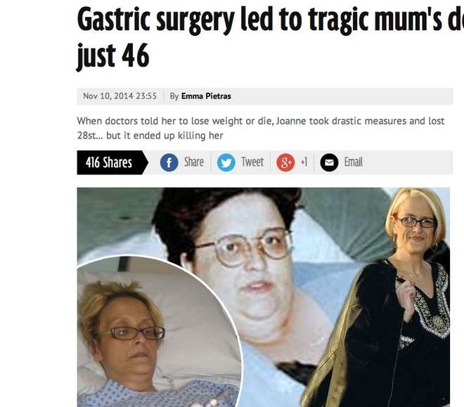 Falë operacionit gruaja angleze nga Londra arriti që të humbë më shumë se 170 kilogramë, por pas 16 vitesh gjeti vdeken, për shkak të komplikimeve nga ndërhyrja. Ndërhyrja në stomak ishte bërë me sukses dhe i kishte ndryshuar për mirë jetën, madje ishte bërë nënë dy herë.