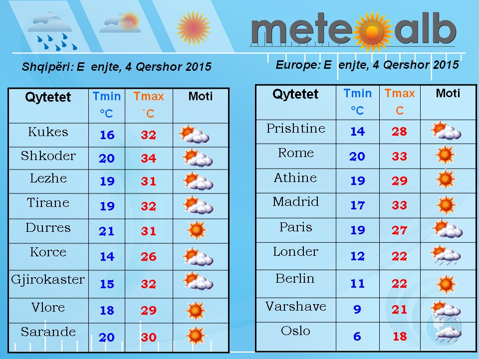 Moti i qëndrueshëm pritet të dominojë gjatë ditë së enjte 4 qershor 2015 në të gjithë territorin shqiptar.