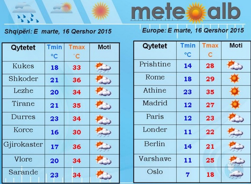 Sipas MeteoAlb, temperaturat e ajrit nuk do të pësojnë ndryshime të dukshme duke ruajtur të njëjtat vlera të tyre konstante. Era do të fryjë e lehtë në tokë dhe në det me shpejtësi 15 km/h dhe drejtim jugperëndimor duke sjellë dallgëzim 1 ballë në brigjet e Adriatikut dhe Jonit.
