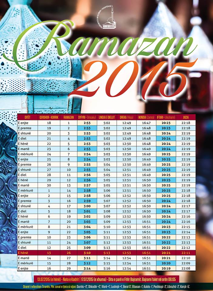 Prishtinë, 15 qershor 2015 – Kryesia e Bashkësisë Islame të Kosovës njoftoi sot besimtarët dhe gjithë opinionin e gjerë se Muaji i Madhëruar i Ramazanit fillon ditën e enjte më 18 qershor 2015.