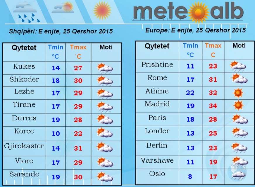 Vendet Nordike si edhe vendet e Lindjes do të ndodhen nën ndikimin e vranësirave dhe shirave si pasojë e masave ajrore të freskëta dhe të lagështa me origjinë oqeanike. Po ashtu me vranësira dhe shira do të paraqitet Ballkani verior dhe ai lindor por në këto rajone shirat do të jenë të përkohshëm. Ndërsa pjesa më e madhe e Europës do të jetë nën ndikimin e motit të kthjellët si rezultat i qarkullimit të masave ajrore të qëndrueshme kontinentale./a.y/noa.al