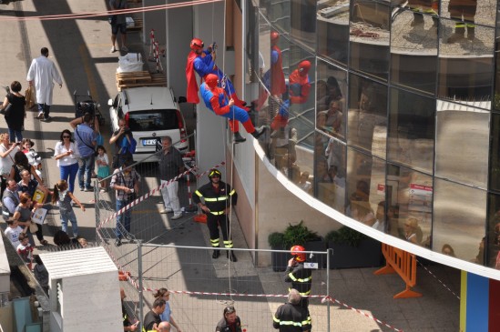 Të veshur si Spiderman dhe Superman, zjarrfikësit, përtej vizitës, dhuruan edhe një shfaqje enkas për vogëlushët duke u lëshuan përmes litarit nga tarraca e spitalit.