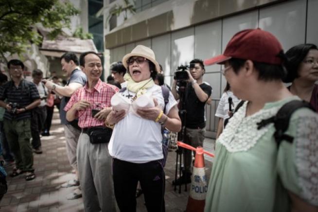Me qindra burra e gra, zbritën në shesh për të mbështetur Ng Lai-Ying, të veshur me reçipeta.