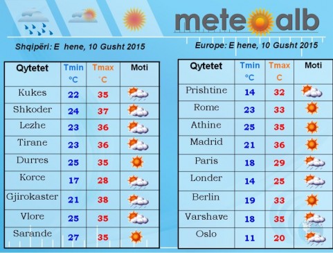 Pjesa e dytë e ditës do të vijojë me kthjellime dhe vranësira të lehta në zonat e ulta dhe bregdetare duke lënë me vranësira dhe shira të përkohshëm zonat malore përgjatë kufirit Lindor. Kjo situatë e motit do të vijojë edhe gjatë natës. Temperaturat e ajrit nuk do të pësojnë shumë ndryshime duke ruajtur të njëjtat vlera të tyre konstante.