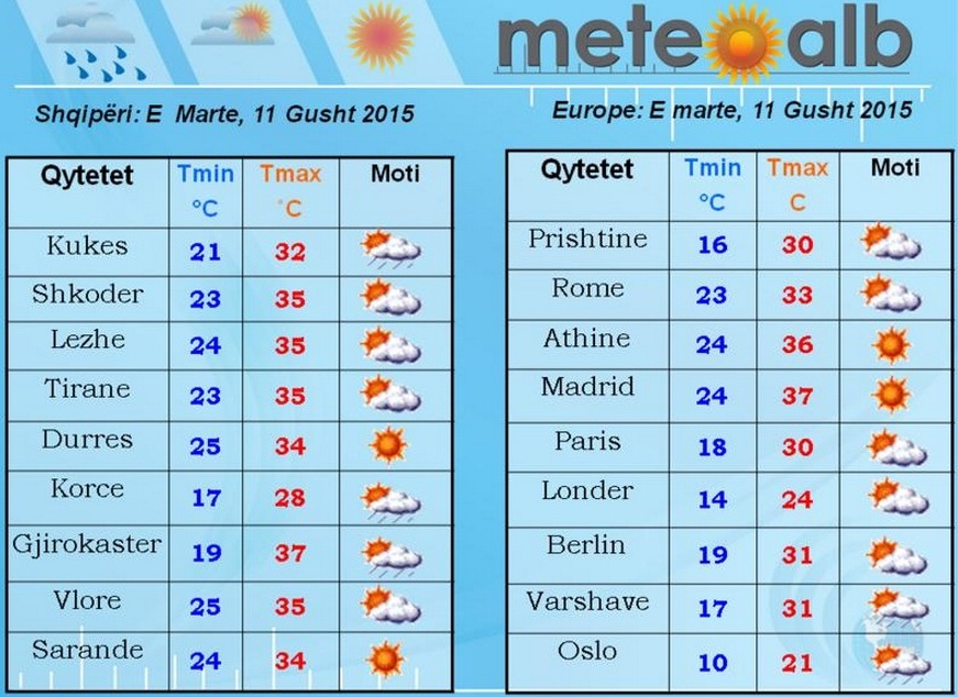 Sipas MeteoAlb, temperaturat e ajrit nuk do të pësojnë ndryshime të ndjeshme, si në vlerat e mëngjesit ashtu dhe në vlerat e mesditës. Era do të fryjë mesatare, me shpejtësi deri 27 km/h nga drejtimi jugperëndimor duke bërë që në det të gjenerohet dallgëzim 2 – 3 ballë.